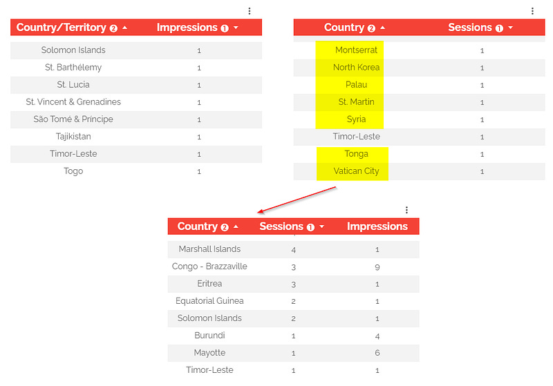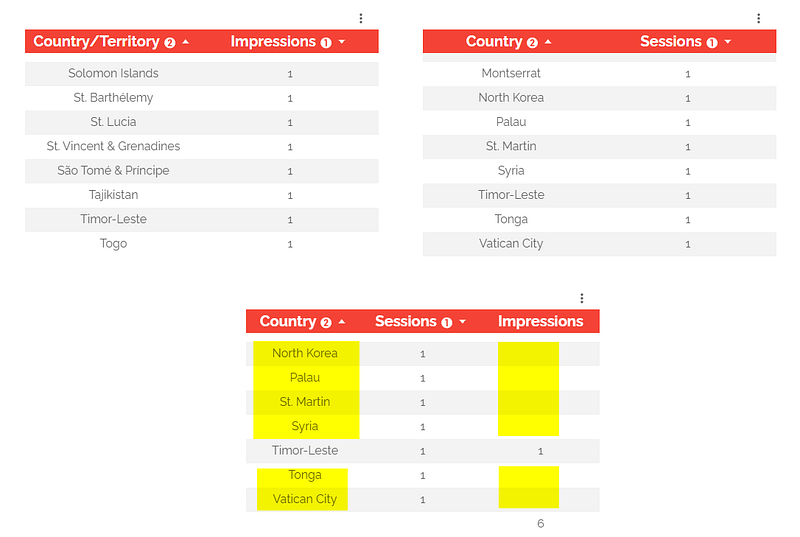 In our example, we’ve got 1 sessions in Montserrat, North Korea, Palau, St. Martin, Tonga or Vatican City but no impressions -> the countries will not be returned in the blended table: