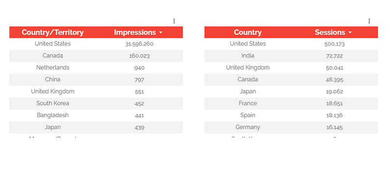 For this example, we’re going to use GA4 and Google Ads sample data. We’ve got two tables at hands: the first ones shows the Google Ads impressions by country/territory, and the second one the GA4 sessions by country. In this case, you’ll notice that both tables share the same dimension. Make sure that they are in the same type/format before moving to the next step.