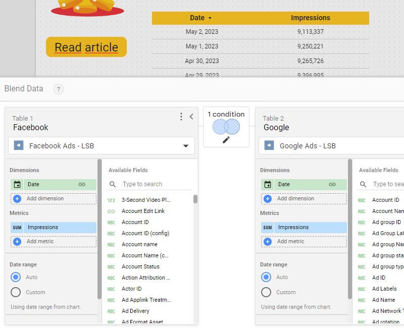 In this example, we’ll be using a sample Google Ads data source blended to a sample Facebook ads data source, looking at impressions by date (full outer join on date):
