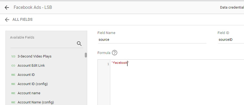 For the facebook data source, we’ll add a field called source, ID sourceID, and just input ‘facebook’