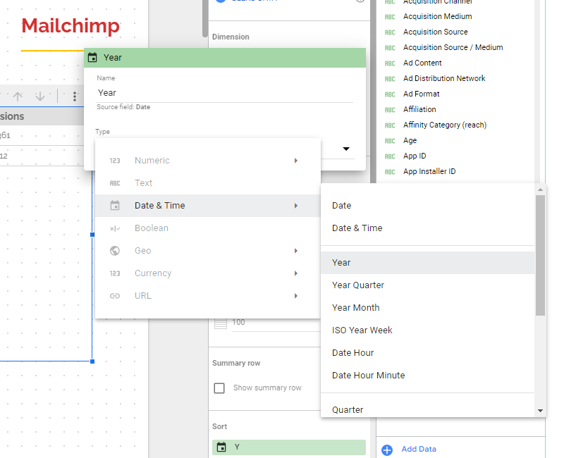 Now, add your Date dimension 3 times (I think by default it’s what Looker Studio does when you click on drill down as it knows where you’re getting at). For the first one, change its name to Year and the type/format to Year: