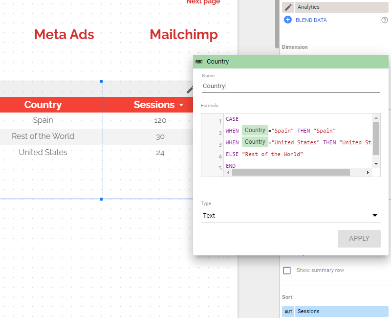 F*cking long tail, impossible to read, so I want to group all small countries together (small in terms of sessions, obviously). In order to do so, I’ll create a new dimension to replace the current Country one, Add field,and input the following formula: