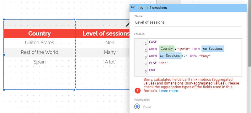 Be careful here, the default aggregation is going to be key. If you write a condition like WHEN sessions>100, and that the default aggregation is sum, well condition will apply when SUM(sessions)>100 in reality. But if default aggregation was average, then your condition would be AVG(sessions)>100, not the same right?