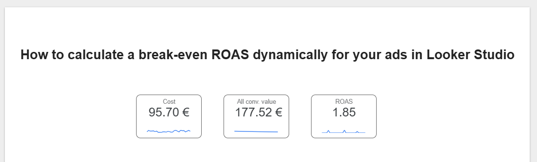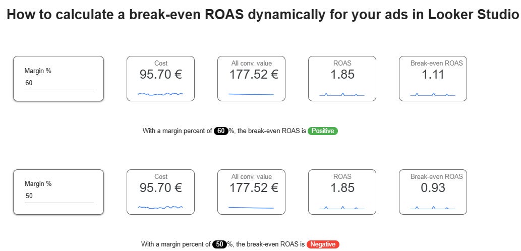 And tadam, you’ve got your break-even ROAS. Want to get it to the next level? Add an input box where your users can set the margin % and see the impact live, then add dynamic text with a conditionally formatted variable to shed more details, and you can end up with some nice visuals (these have been done in 5 minutes, pretty sure you can do way better!):