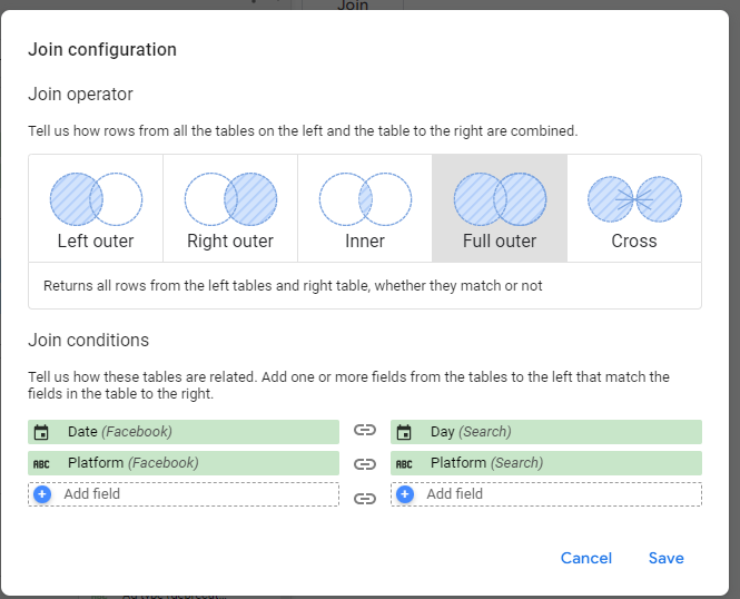 Similarly, for the Google Ads table we’ll use the Date field as a dimension (called Day here), and the Platform custom field with ‘Google’ in the formula.