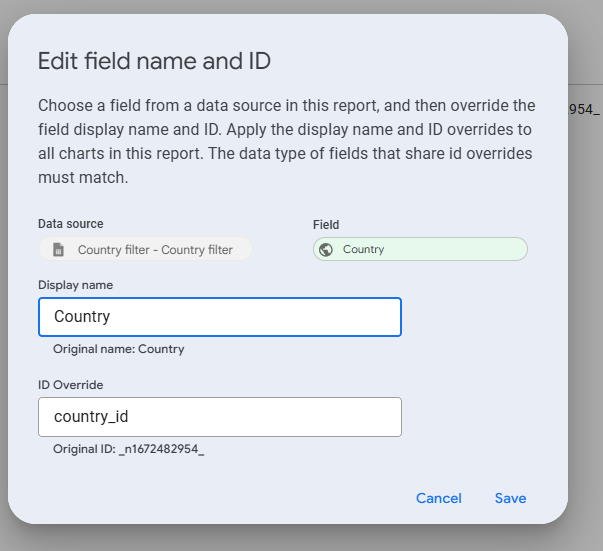 First: select the first data source, the field you want to override, set its display name and choose an ID override
