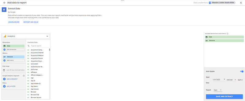 Linked to what we’ve seen previously, we can cache data directly in Looker Studio using the Extract data data source. Basically, it allows you to cache data from any existing data sources. Reduce the number of fields (dimensions & metrics) and put a date range restriction, so when data is pulled, it goes through less rows and runs faster: