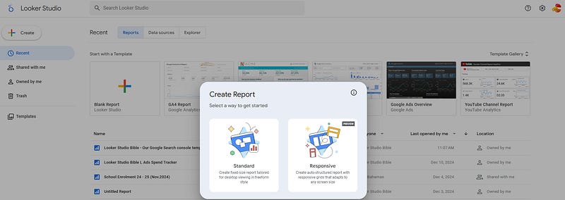 So, heading to Looker Studio homepage, we click create a Blank Report as always, and a nice pop-up appears inviting us to choose our report type: