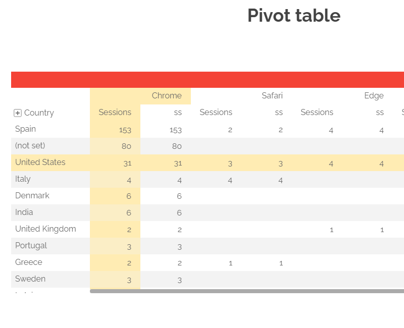 Regular tables! In this article about how to do a year to date, year over year comparison in Looker Studio?, I explain how to recreate a fake this year metric. Actually, it could be applied to any dimension, you just have to modify the formula a bit and you can show only one channel, one country, … It’s good if you’ve got a limited number of values in your dimension. But if you were to have more, then I’m not sure pivot table would have been the right dataviz anyways. Maybe a line chart or a bar chart would do the job better.